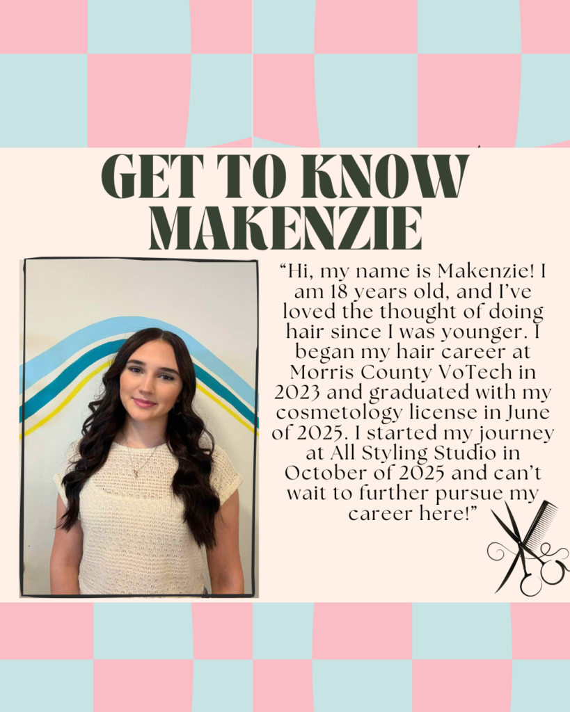 Alexa is in the industry to learn all about hair and deliver results! She started here in 2023 and is currently in her Junior Stylist role at All Styling while learning and growing to become our very own Junior Stylist. We are so proud of this young, fun, natural talent! Her passion is color correction, blending, and medium to long cutting, including curly hair!